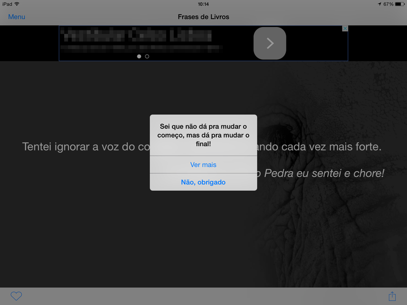 No entanto, a tela Frases de Livros é constantemente poluída por banners de propagandas e anúncios invasivos. Porém, é possível comprar uma atualização que remove toda publicidade do aplicativo.