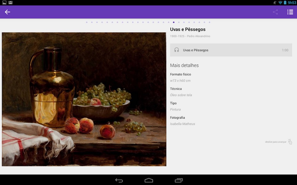 Cada obra traz uma ficha técnica e algumas oferecem áudio com comentários de voz, o que enriquece as informações sobre ela. O ideal é que para aqueles usuários que estão conectados em redes com pouca velocidade, visualizem através do álbum, que consome muito menos dados, já se estiver em Wi-Fi ilimitado, a ferramenta StreetView é a melhor pedida.