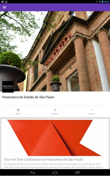 O Pinacoteca de São Paulo é um aplicativo gratuito para Android, que oferece aos usuários uma visita virtual pelo museu da cidade. Nele é possível visualizar as exposições obra a obra ou utilizar o recursos StreetView para navegar pelo espaço, acessando cada painel. Também dá para explorar por este recurso o próprio prédio, descobrindo suas particularidades e exposições.